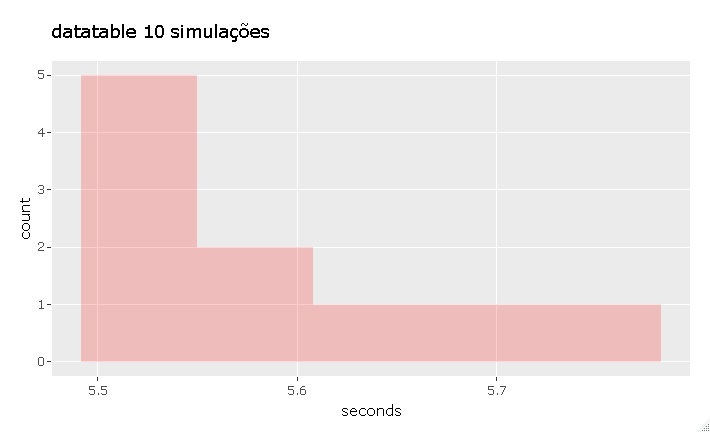 Aqui o dplyr levou de 28 à 230 segundos, contra 5.5 à 5.7 segundos do datatable.