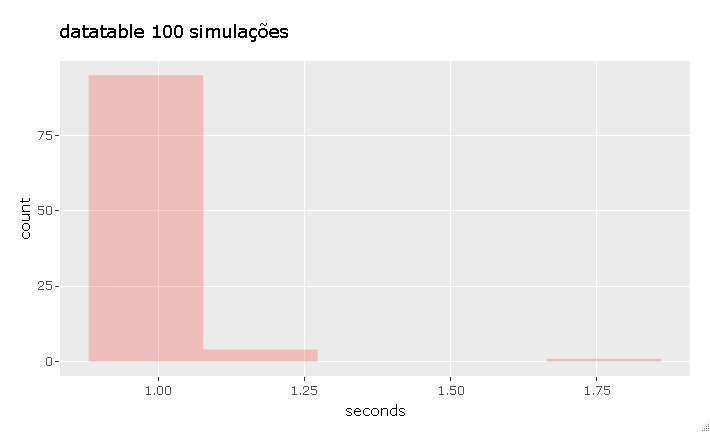 1 segundo com datatable e uma variação muito pequena desse tempo quando repetimos a ação várias vezes, já o dplyr leva de 2 à 4 segundos. A coisa fica pior para o dplyr se tivermos interesse num grupo maior e em mais resultados no summarize.